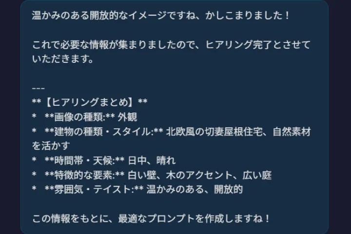 • 「ナチュラルな外観、素敵なリビング」といった抽象的な要望にもAIが的確に対応します。